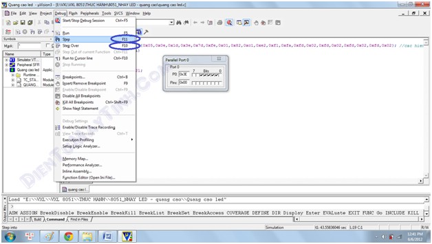 Ở đây chương trình chỉ tác động lên Port0 nên ta sẽ mở khung quan sát Port0 lên.